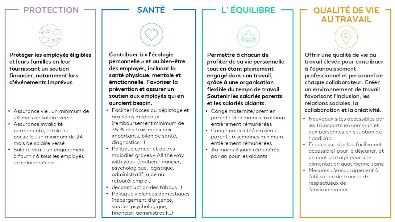 Nous veillons à ce que tous nos collaborateurs dans le monde aient accès à la meilleure protection sociale, à la couverture santé et au bien-être au travail.