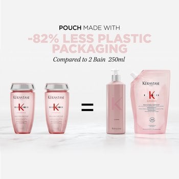 Kérastase propose un duo formé d’une bouteille de shampooing réutilisable entièrement composée d’aluminium recyclé et recyclable ainsi que d’une recharge souple. Une recharge permet d’utiliser 82 % de plastique en moins que deux bouteilles de shampoing de 250 ml. Ce duo réduit les déchets plastiques associés aux bouteilles de shampoing à usage unique, et fait du luxe une pratique responsable.