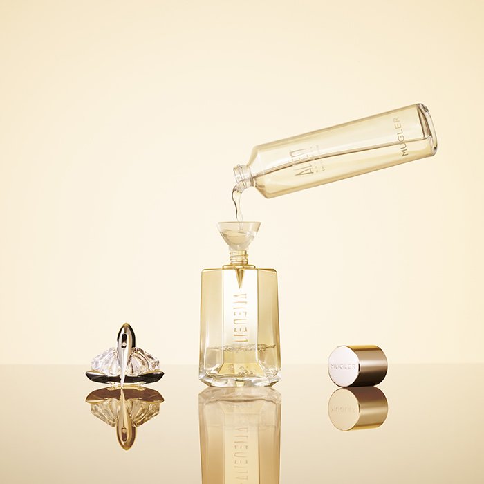 Afin de permettre aux amoureux des parfums Mugler de conserver leur flacon bien aimé, mais aussi de rendre ses parfums le plus accessibles possible, Mugler améliore constamment ses Fontaines à parfum, s’appuyant sur une tradition vieille de plusieurs siècles et permettant à ses clients de remplir leur bouteille à l’infini. En parallèle, le rituel de recharge à la maison représente un autre geste écoresponsable qui aide à préserver l’environnement en réduisant les déchets.