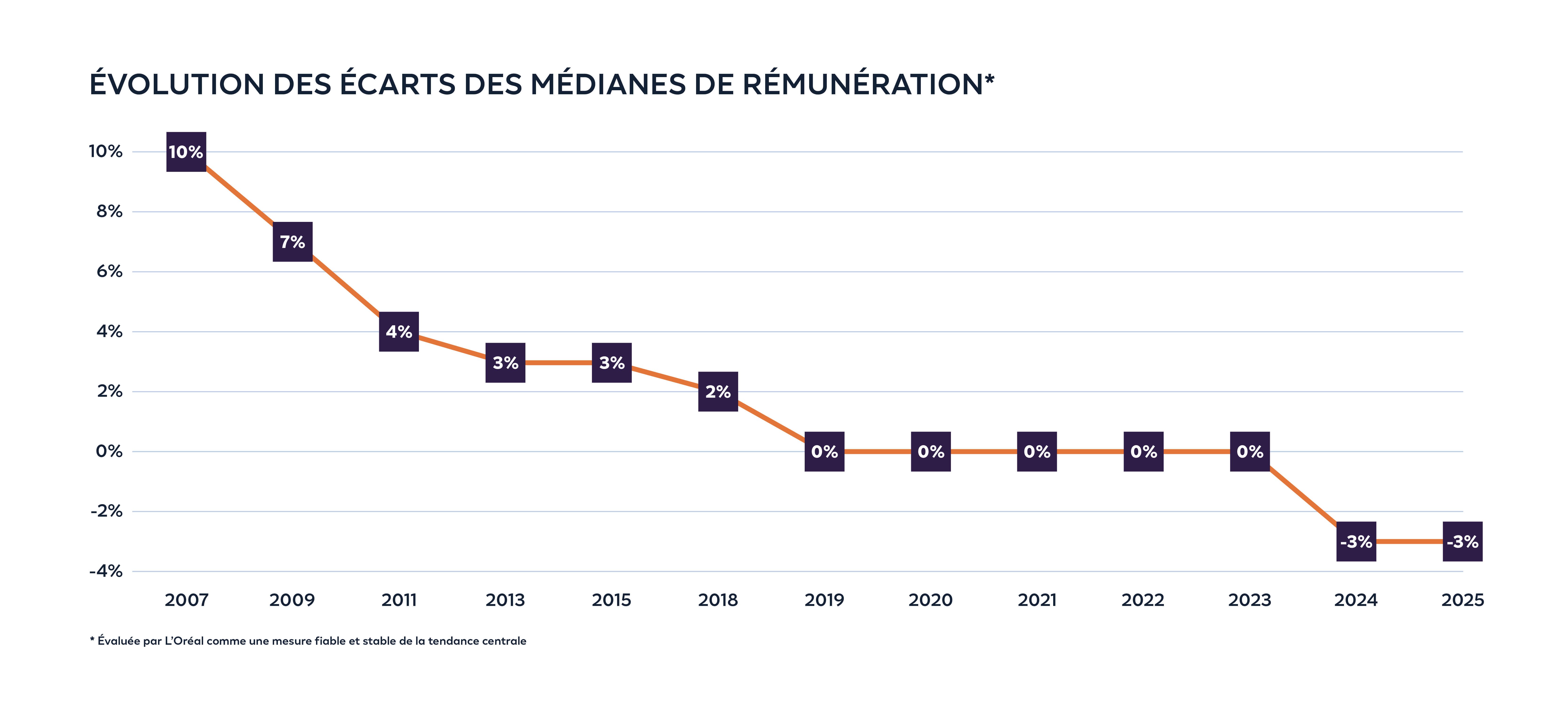 Depuis 2007, en collaboration avec l’INED (Institut national d’études démographiques), L’Oréal procède à une analyse annuelle des écarts de rémunération entre les femmes et les hommes travaillant en France. Cette analyse porte sur les écarts des médianes, moyennes et moyennes ajustées de rémunération entre les femmes et les hommes.