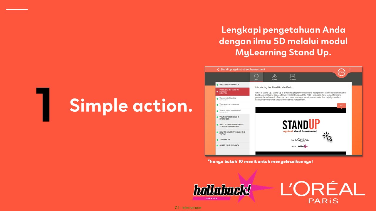 L'Oréal Paris bersama dengan Hollaback! telah menyediakan sebuah materi berupa modul 5D, sebuah modul yang dapat membantu kita ketika kita menjadi korban pelecehan atau melihat terjadinya pelecehan seksual.