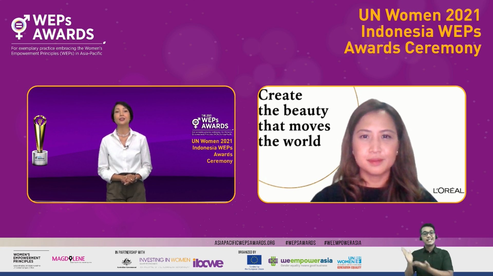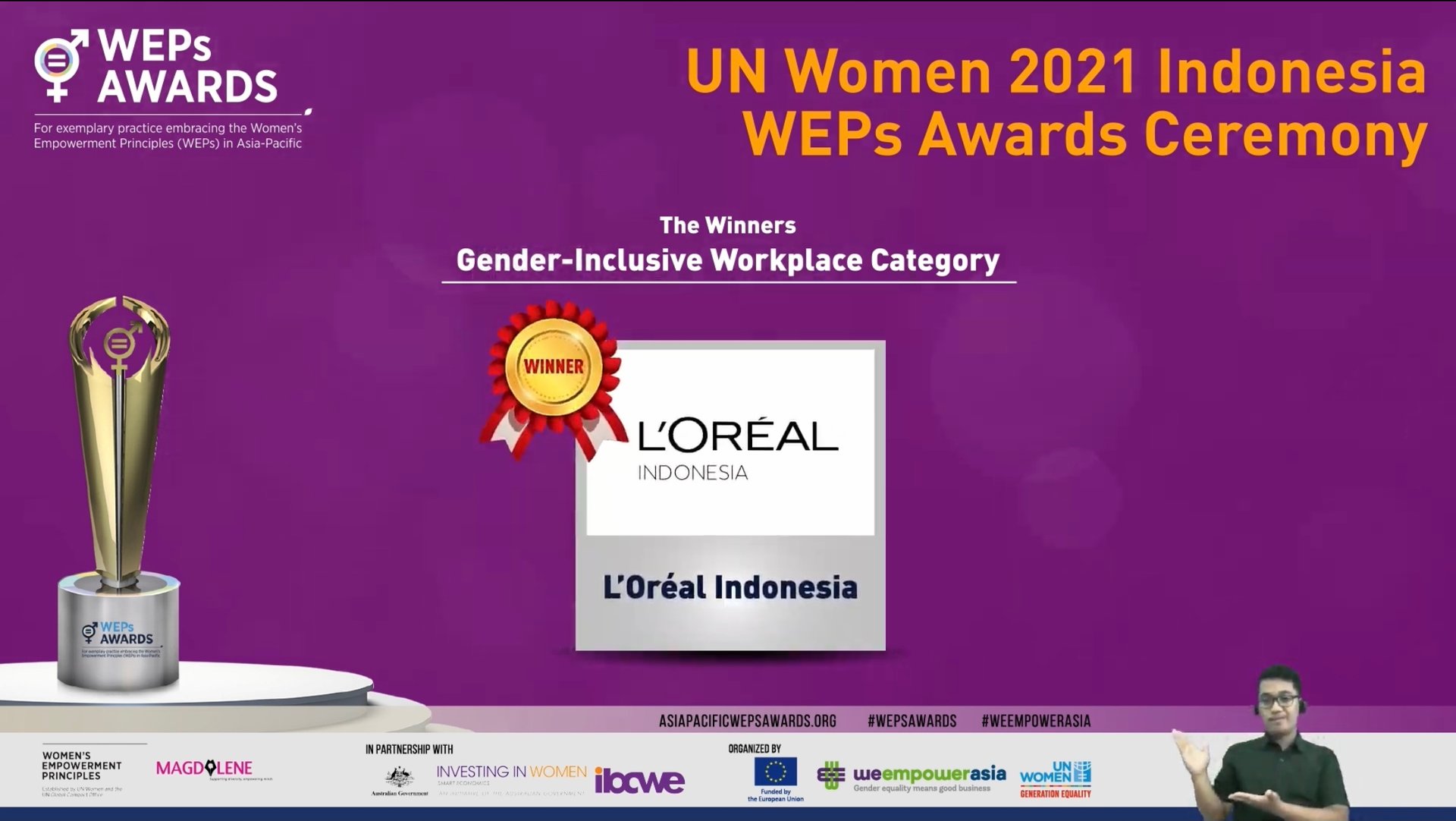 Indonesia, 22 Oktober 2021 - L'Oréal Indonesia dinobatkan sebagai pemenang dalam kategori Gender Inclusive Workplace dalam penghargaan Women's Empowerment Principles (WEPs) Awards yang diadakan oleh UN Women Indonesia. Penghargaan diberikan atas komitmen dan inisiatif kebijakan perusahaan dalam mempromosikan kesetaraan gender di tempat kerja. Sebagai pemenang, L'Oréal Indonesia akan mewakili Indonesia di tingkat Asia-Pasifik pada saat acara penghargaan regional tanggal 18 November 2021 mendatang.