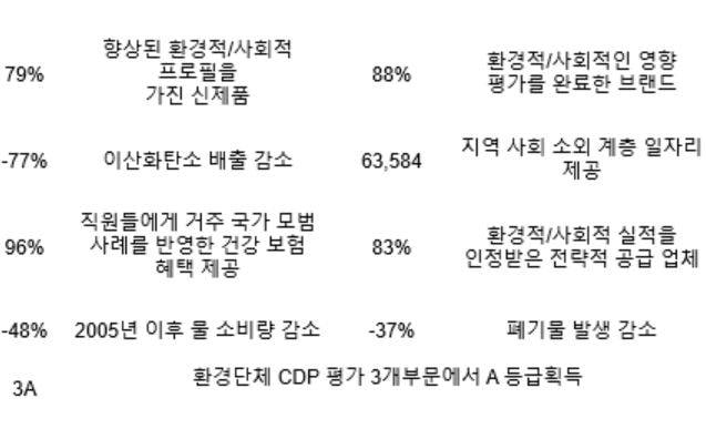 · 지속가능한 혁신(Sustainable Innovation) - 2020년까지 제품개발 및 리뉴얼시 전 제품이 환경적 또는 사회적 혜택을 갖출 수 있도록 합니다.