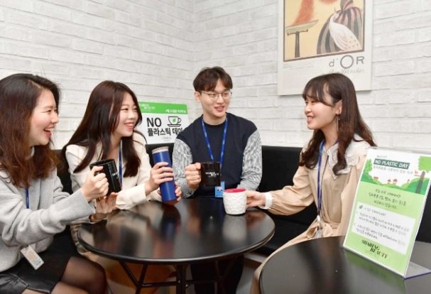 [사진 II] 로레알코리아는 4월 22일(월) 지구의 날을 맞아 삼성동 본사 내 카페에서 ‘노 플라스틱 데이(#NoPlasticDay)’ 행사를 진행했다. 노 플라스틱 데이 캠페인에 참가한 임직원들이 환경보호를 위해 일회용 플라스틱 컵 대신 개인 머그컵에 음료를 받아 마시며 즐겁게 담소를 나누고 있다. |